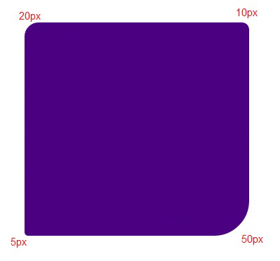 /* Para que funcione en Firefox */ -moz-border-radius: 20px 10px 50px 5px; /* Para que funcione en Safari */ -webkit-border-radius: 20px 10px 50px 5px;