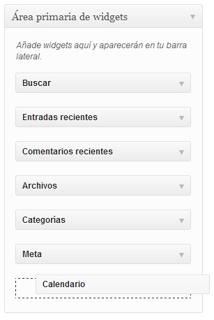 Para agregar un Widget, debemos arrastrarlo con el mouse y posicionarlo dentro de una de las cajas de la derecha, por ejemplo yo voy a agregar un calendario a ‘Área primaria de widgets’.