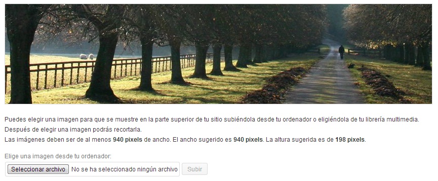 Aquí seleccionamos una imagen, la subimos y luego pulsamos el botón ‘Subir’. Tener en cuenta los requisitos que nos pide WordPress: ‘Las imágenes deben ser de al menos 940 pixels de ancho. El ancho sugerido es 940 pixels. La altura sugerida es de 198 pixels‘