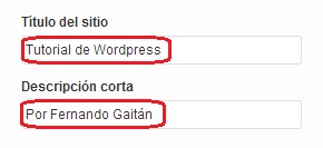 El único cambio que voy a realizar es en el apartado es el que dice: ‘Título del sitio y descripción corta’. Aquí yo voy a dejar el título como está desde que lo instalé, con el texto: ‘Tutorial de WordPress’ y en la descripción ‘Por Fernando Gaitán’