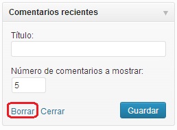 Si lo que en cambio queremos hacer es borrar, por ejemplo yo voy a borrar el Widget ‘Comentarios recientes’, simplemente debemos pulsar encima del mismo y luego hacer clic en ‘Borrar’